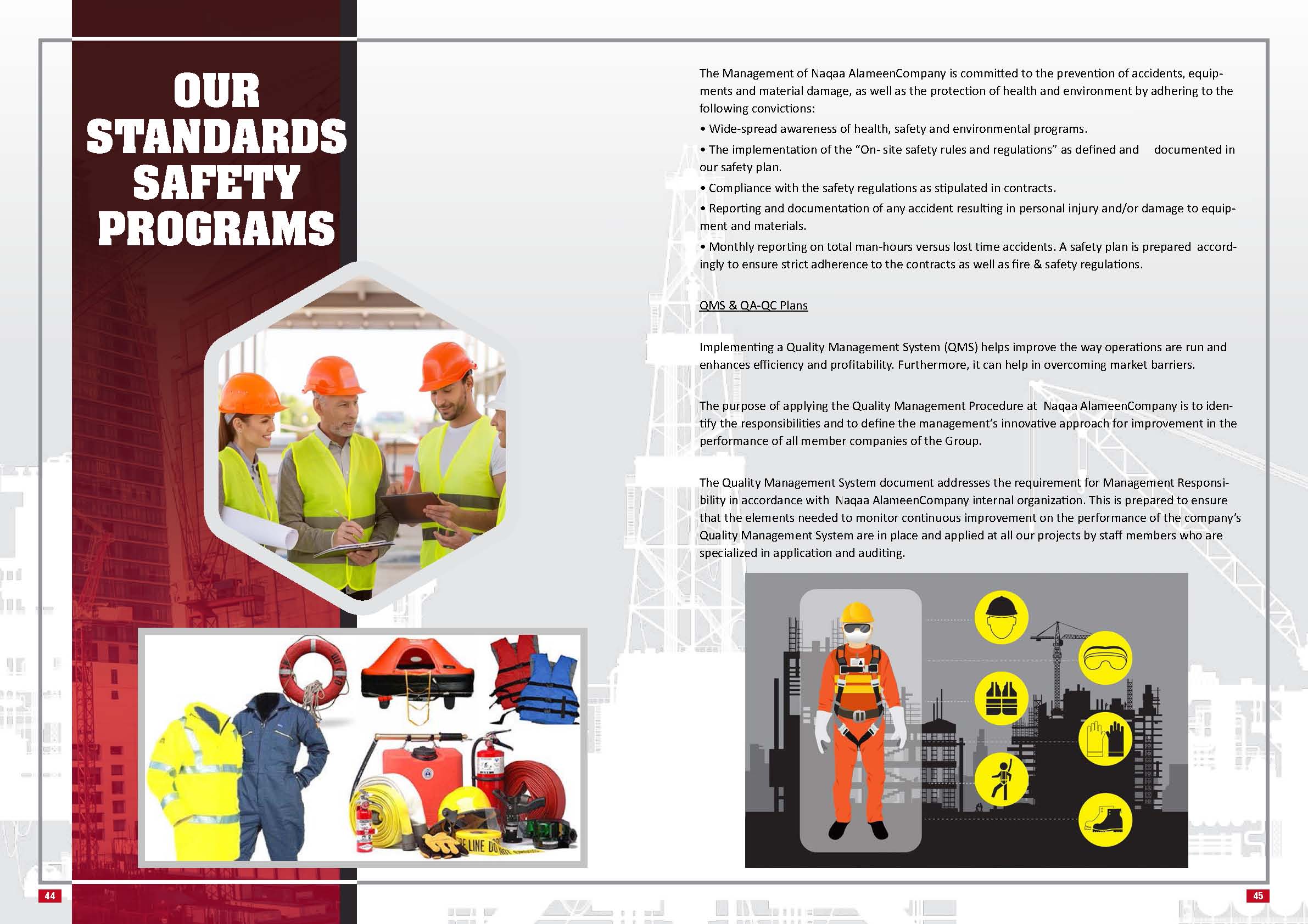 The Management of Naqaa AlameenCompany is committed to the prevention of accidents, equipments and material damage, as well as the protection of health and environment by adhering to the following convictions: • Wide-spread awareness of health, safety and environmental programs. • The implementation of the “On- site safety rules and regulations” as defined and documented in our safety plan. • Compliance with the safety regulations as stipulated in contracts. • Reporting and documentation of any accident resulting in personal injury and/or damage to equipment and materials. • Monthly reporting on total man-hours versus lost time accidents. A safety plan is prepared accordingly to ensure strict adherence to the contracts as well as fire & safety regulations.